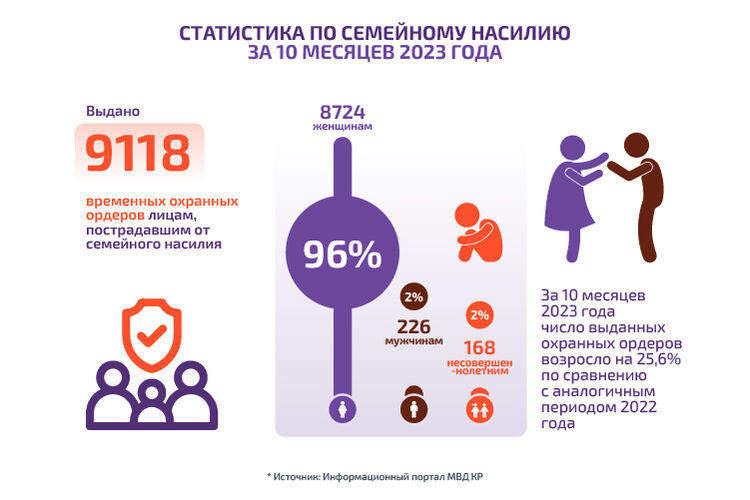 Кыргызстан ратифицировал такие международные документы, как Конвенция ООН о ликвидации всех форм дискриминации женщин, Пекинская декларация и платформа действий. Профилактика и защита от семейного насилия закреплены в Конституции страны, уголовном законодательстве, национальной политике, стратегиях.