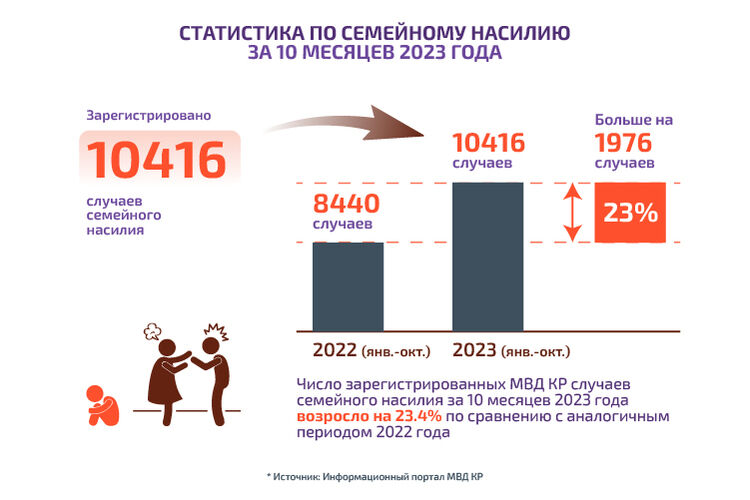 В Кыргызстане количество зарегистрированных преступлений на гендерной почве растет, а пережившие насилие сталкиваются с препятствиями в получении услуг на всех этапах непрерывного процесса оказания помощи потерпевшим гендерное насилие, который включает как минимум четыре — профилактику гендерного насилия, реагирование на гендерное насилие, управление правосудием (доступ к правосудию) и реабилитацию лиц, совершивших семейное насилие (прохождение коррекционной программы по изменению насильственного поведения). Об этом говорится в исследовании «Как прервать цикл насилия: анализ барьеров и стратегии по искоренению гендерного насилия в Кыргызской Республике». 24-kg.com делится кратким обзором выводов и рекомендаций, приведенных в исследовании.