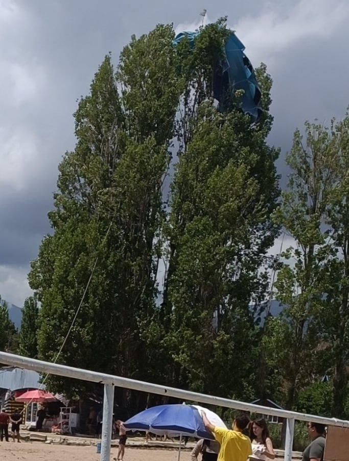 Ранее в социальных сетях появилось видео, как на пляже в селе Кара-Ой мужчина с ребенком едва не влетели в дерево. До этого пользователи сети сообщали, что недалеко от Чолпон-Аты парашют с отдыхающими приземлился прямо в озеро, едва не врезавшись в пирс.