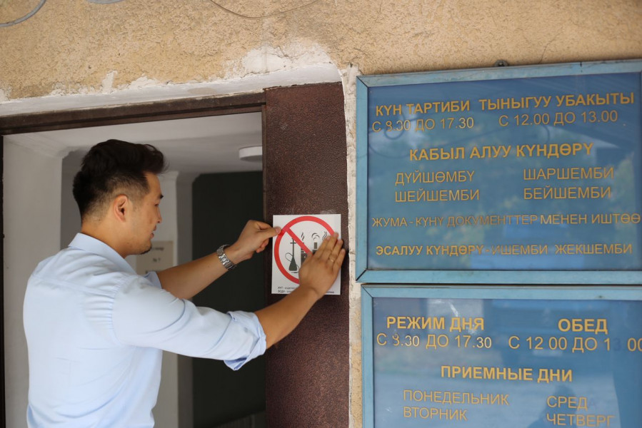 Сотрудники муниципальной администрации Первомайского района разместили знаки о запрете курения. Об этом сообщила пресс-служба мэрии Бишкека.