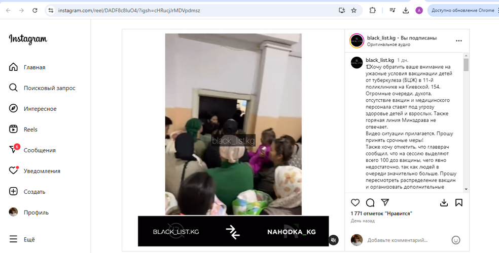 В Бишкеке в поликлинике на Киевской, 154, ужасные условия вакцинации детей от туберкулеза (БЦЖ) — огромные очереди, духота и отсутствие вакцин. Об этом сообщил подписчик страницы black_list.kg в Instagram.