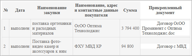 А именно,в разделе «Сведения о наличии опыта аналогичных поставок», где указано, что опыт поставок за последние два года (2013-2014) должен составлять не менее 20 миллионов сомов. «У данного поставщика, по представленным сведениям о квалификации, он (опыт поставок. - Прим. ИА «24.kg») составлял только 3 миллиона 794 тысячи 400 сомов, участник был отклонен», - говорится в официальном письме ГУПМ МВД. Странно, а в протоколе вскрытия, опубликованном на портале госзакупок, комиссию устроило все.