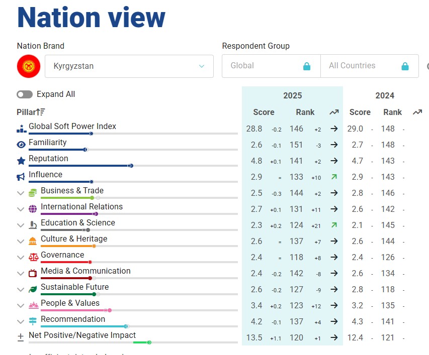 Кыргызстан поднялся на две позиции в Глобальном индексе мягкой силы — 2025 (Global Soft Power Index 2025), заняв 146-е место с 28,8 балла. Данный рейтинг шесть лет подряд составляет консалтинговая организация Brand Finance.