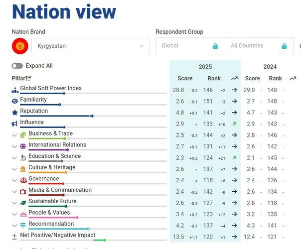Наибольший рост за год был отмечен в категории «Образование и наука» (+21) и «Люди и ценности» (+10). Кыргызстан ухудшил позиции по таким показателям, как «Устойчивое развитие» (-9) и «Медиа и коммуникации» (-8).Первое место в рейтинге занимают США. Второе и третье — Китай и Великобритания. Россия расположилась на 16-м месте, Украина — на 46-м. Беларусь оказалась на 80-й строчке рейтинга.