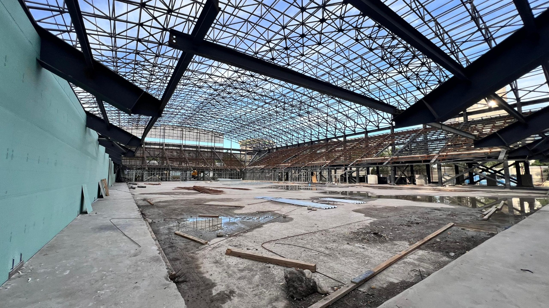 Полностью завершен монтаж металлических конструкций. Ведутся работы по установке сэндвич-панелей и прокладке внутренних электрических сетей.