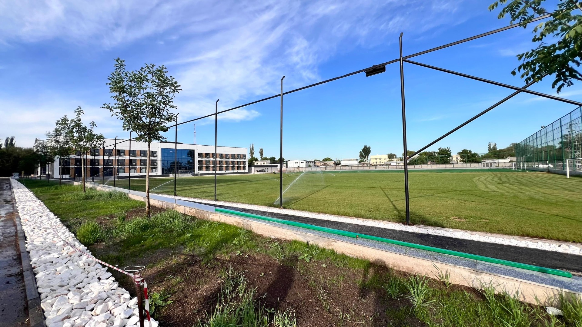 В настоящее время завершены основные работы по строительству футбольного поля категории FIFA-4, тренировочных площадок, парковки и установке системы освещения.