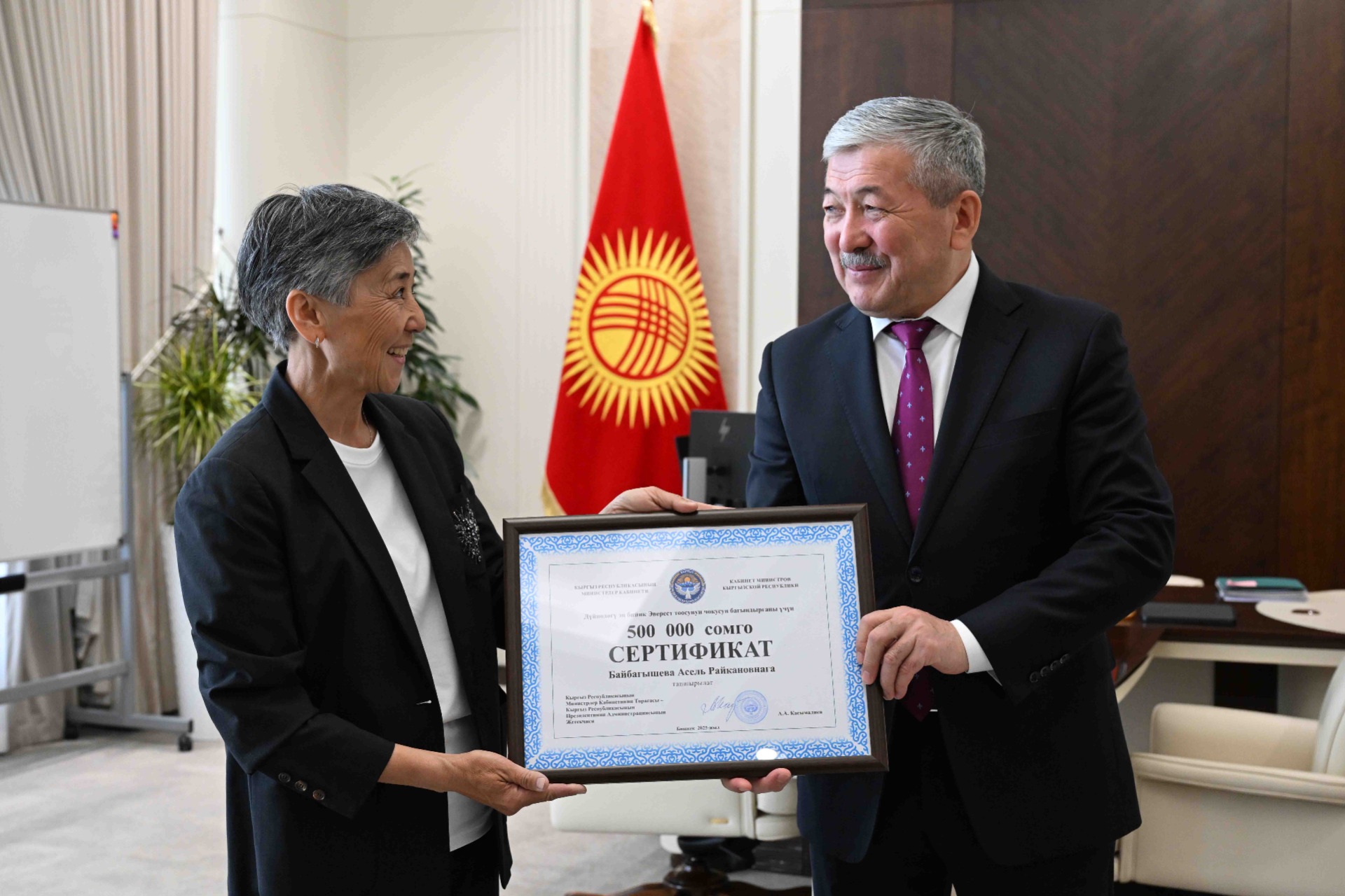Председатель кабинета министров Адылбек Касымалиев вручил альпинистке Асель Байбагышевой сертификат на 500 тысяч сомов. Об этом сообщила пресс-служба кабмина.