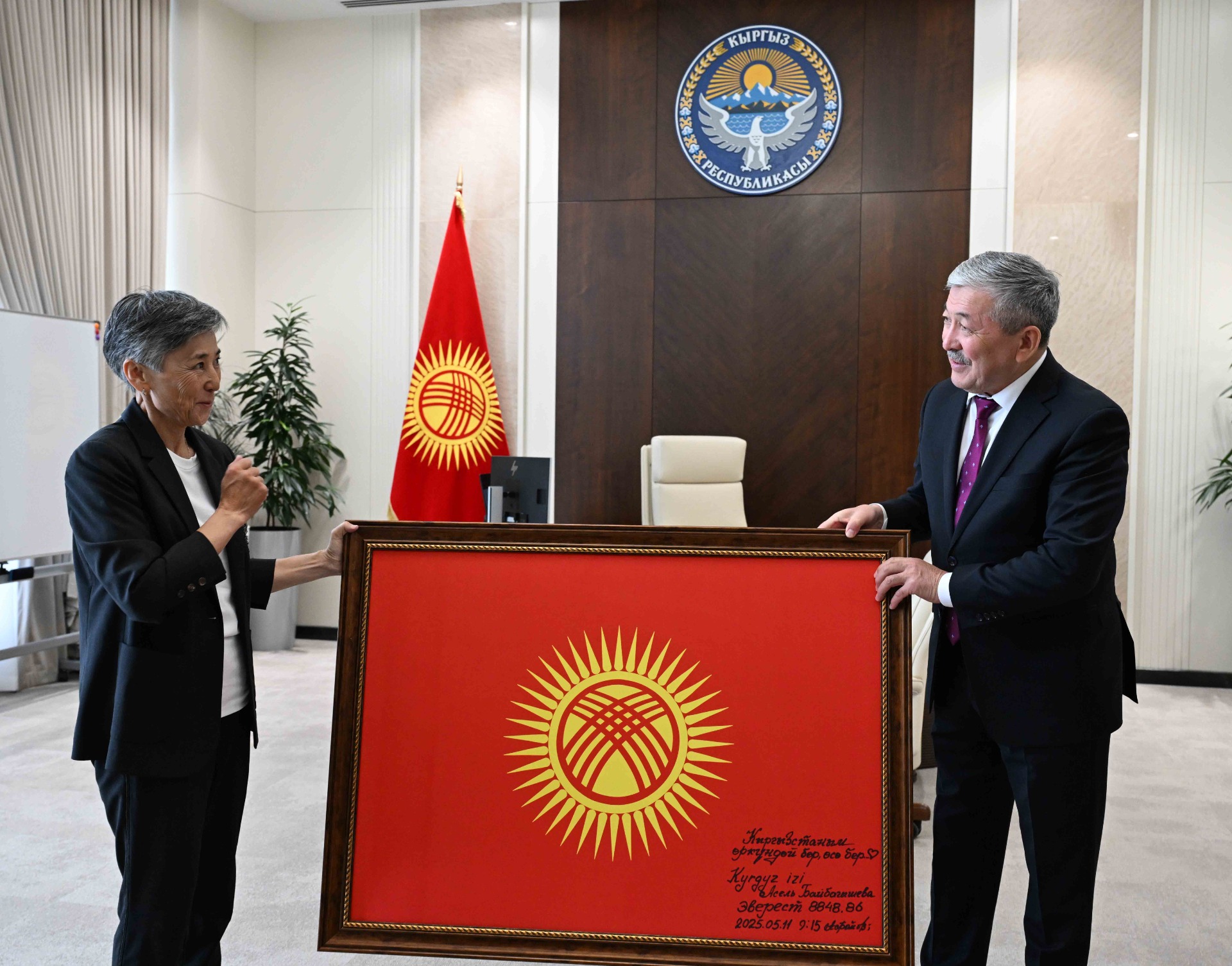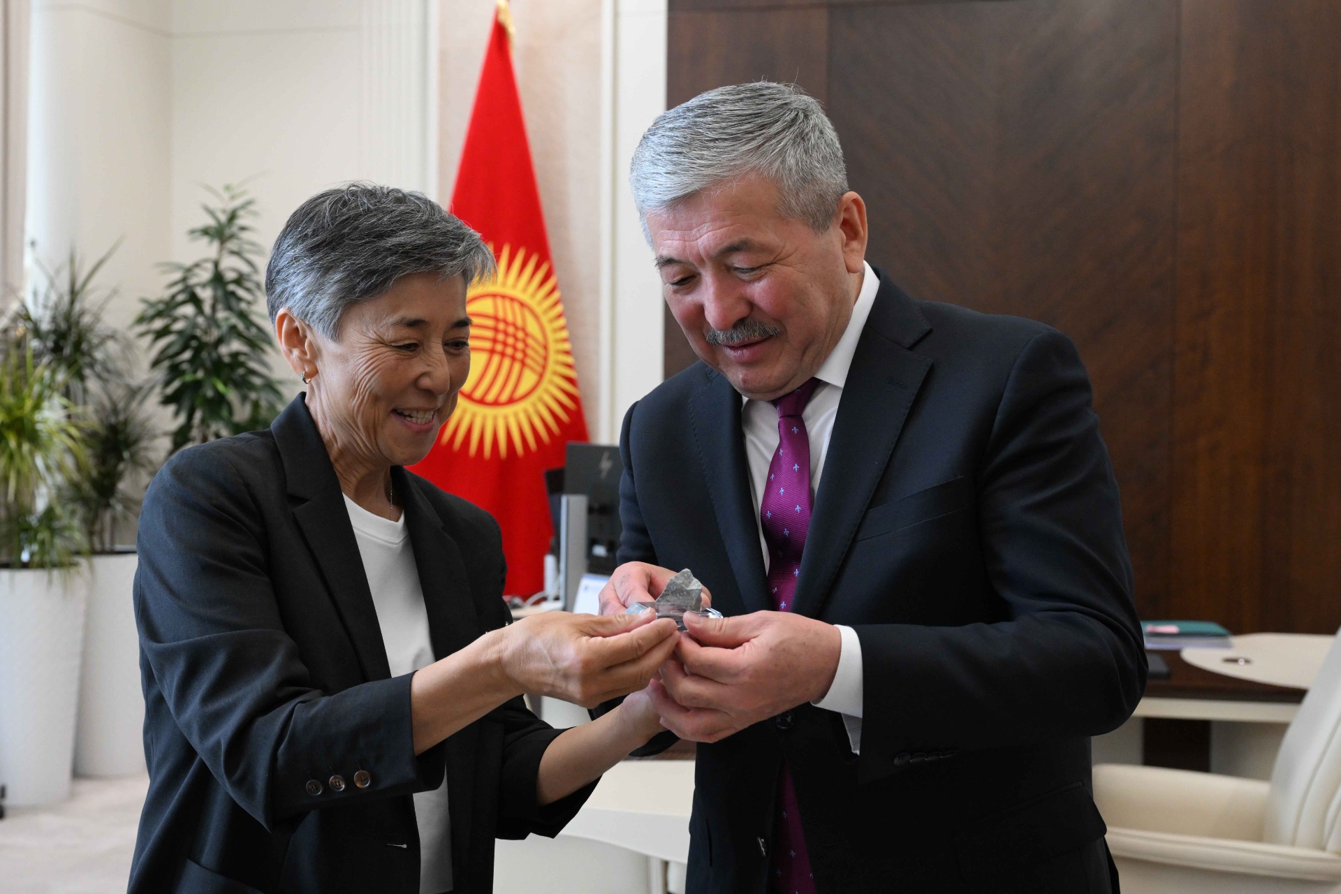В свою очередь альпинистка с гордостью передала государственный флаг КР, который она водрузила на Эвересте. Кроме того, она подарила председателю кабмина камень, который лично привезла с вершины горы.