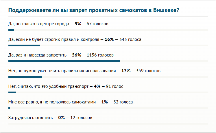 Кстати, 24-kg.com провело опрос по данной теме. Более 2 тысяч респондентов высказались о судьбе электросамокатов. Больше 50 процентов — за их полный запрет, 17 процентов поддержали ужесточение правил, и только 4 процента выступили в защиту.