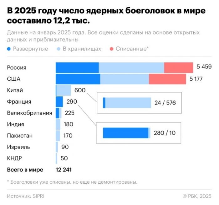 На январь 2025-го в мире была 12 тысяч 241 ядерная боеголовка. Из них 9 тысяч 614 относятся к военным запасам, которые могут быть развернуты. Оставшиеся боеголовки подпадают под категорию списанных, но еще не ликвидированных, отмечает SIPRI.