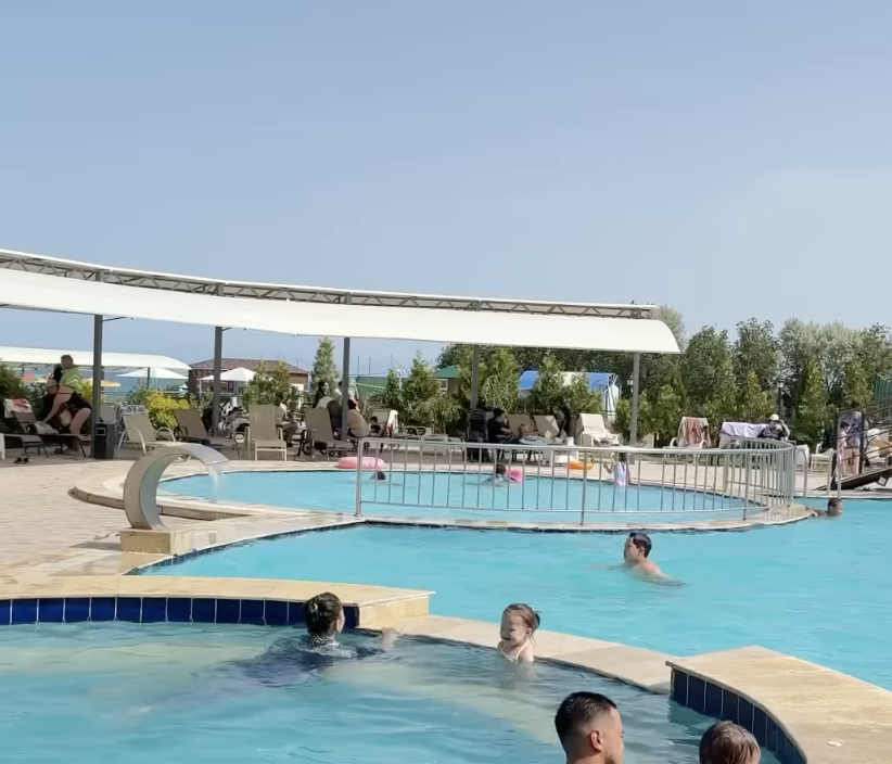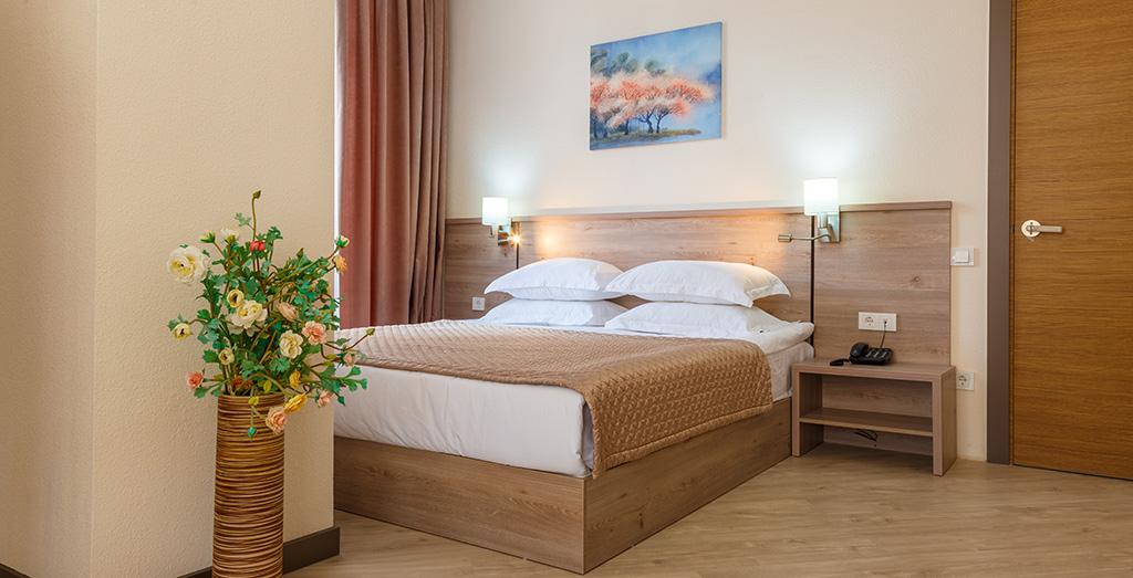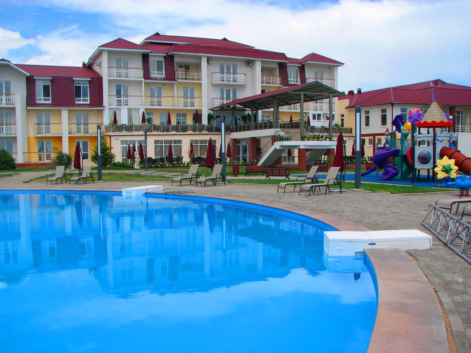 Удобства: трехразовое питание, два бассейна (открытый и крытый), спа-зона, сауна, детская площадка, Wi-Fi, спортивные площадки, песчаный пляж, и различные развлечения с аниматорами.