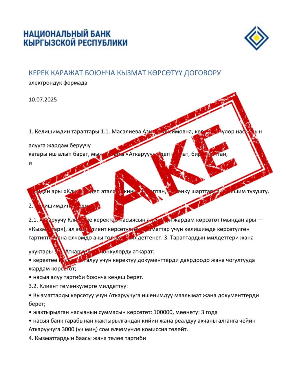Как сообщили в Нацбанке, злоумышленники используют поддельные документы с логотипом учреждения и публикуют фейковые положительные отзывы. Под различными предлогами — страховка, комиссия и прочее — они требуют перевести деньги, отправляя взамен поддельные кредитные договоры.