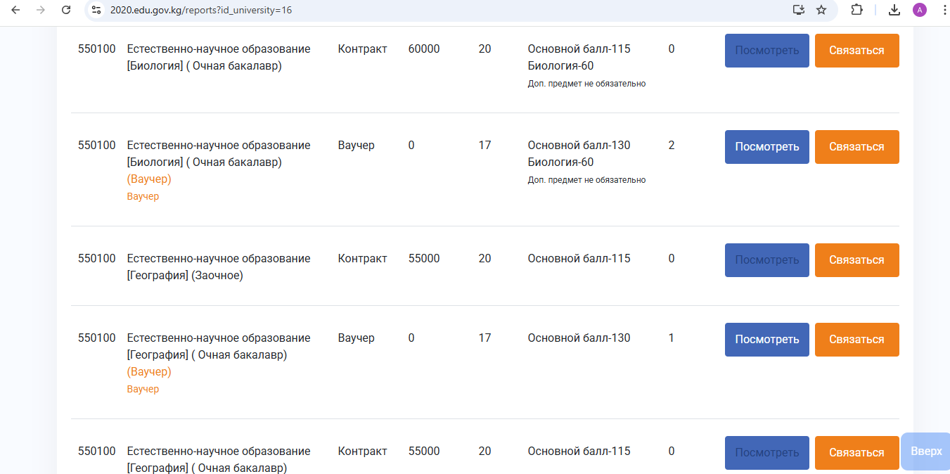 Переход на 12-летнее образование предполагает интеграцию предметов естественно-научного цикла, однако ваучеров на программы двойной специализации, судя по данным портала «Абитуриент online», нет. Ежегодный контракт на этом направлении студентам обойдется в 60 тысяч сомов, желающих в первом туре немного.