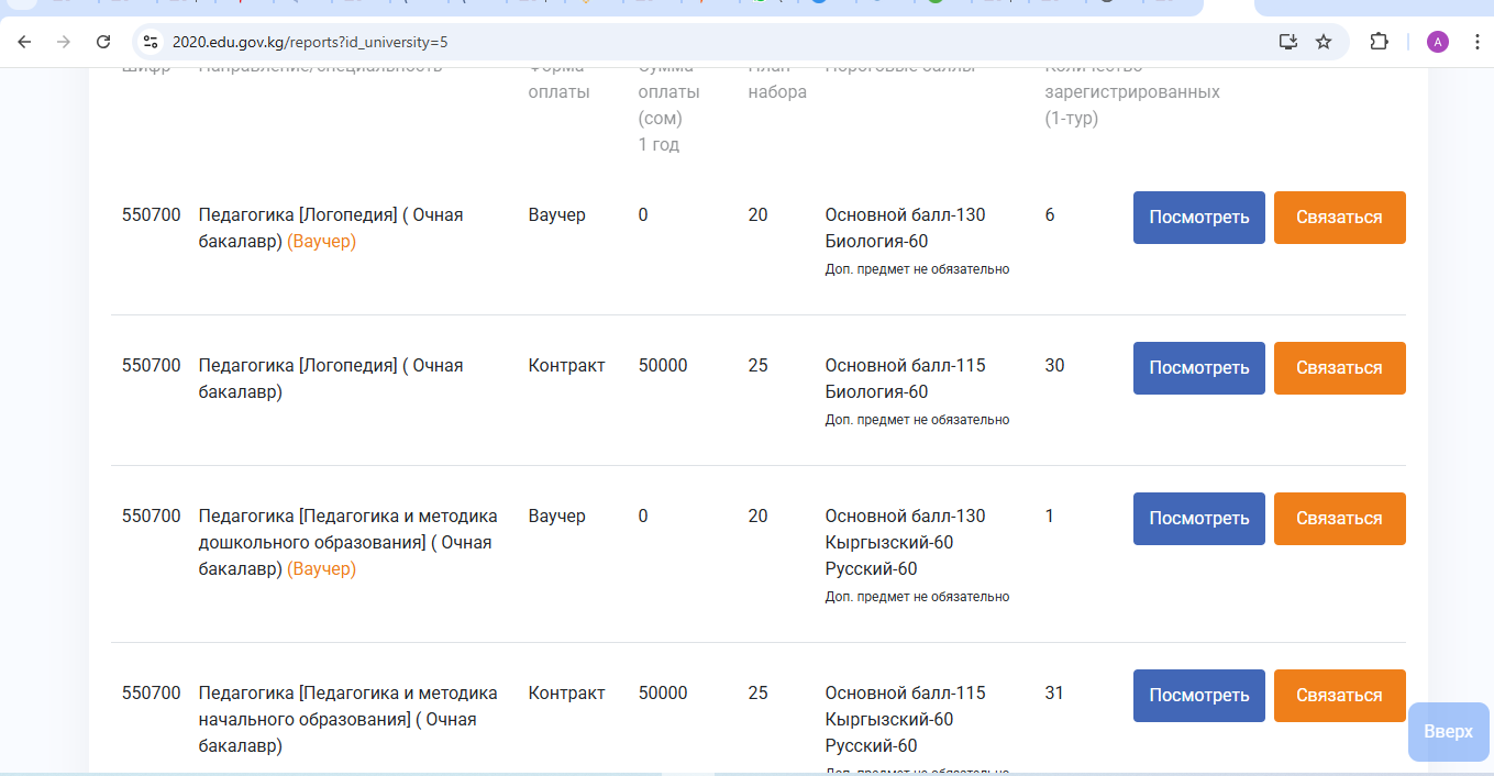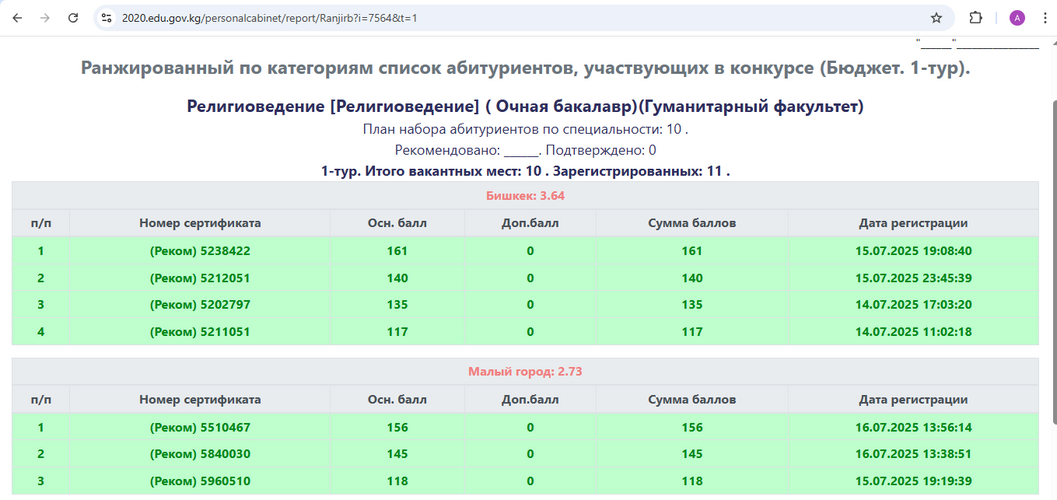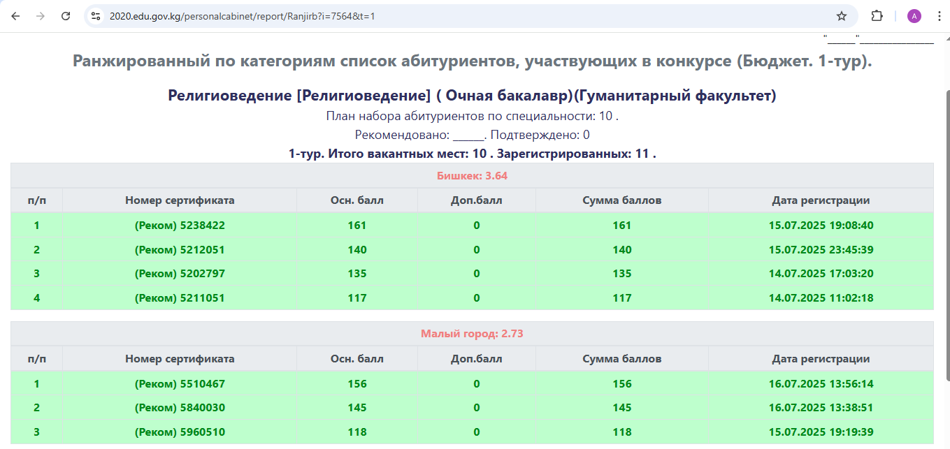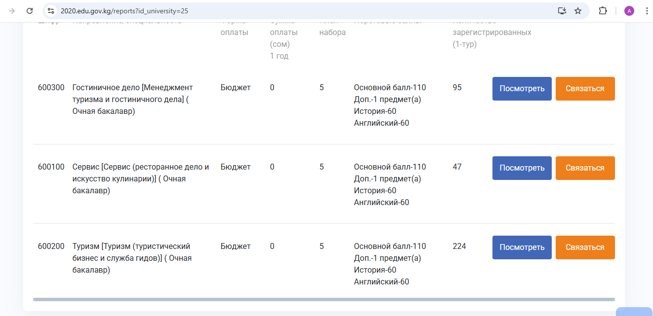 Интересный факт: на бюджет в КРСУ можно поступить, едва перешагнув порог. 117-118 баллов хватило абитуриентам, чтобы их рекомендовали к зачислению по направлению «Религиоведение». На 10 мест претендовало всего 11 человек. Контракт по этой специальности обошелся бы в 120 тысяч сомов. Желающих учиться за свой счет в первом туре не нашлось.