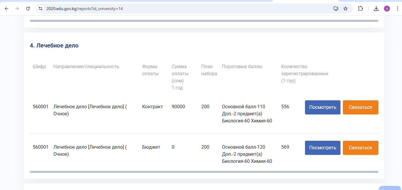 Кстати, самый высокий план набора на контрактное обучение — 800 человек — анонсировал Азиатский медицинский институт имени С.Тентишева по направлению «Лечебное дело». Но в первом туре не оказалось ни одного зарегистрированного, хоть контракт и ниже, чем в других медвузах.