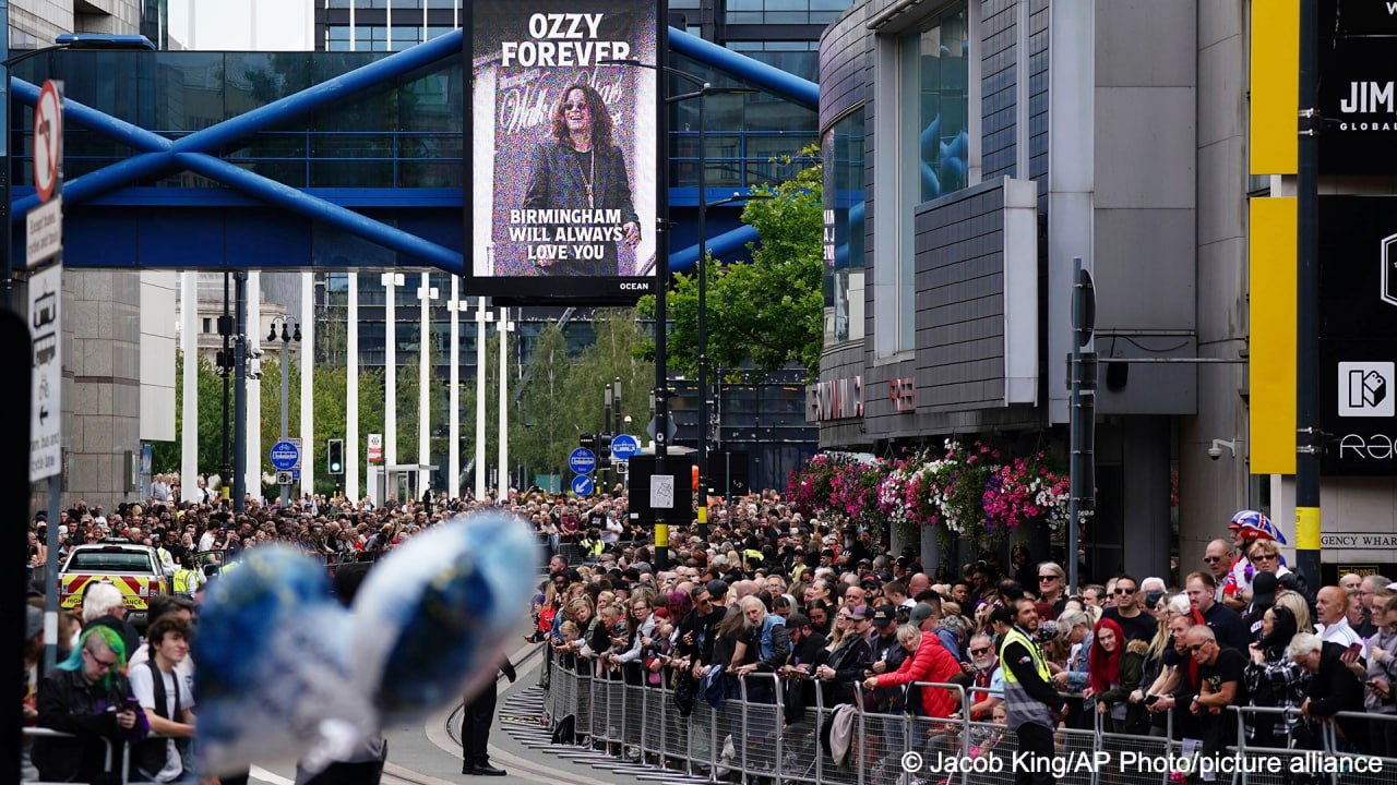 Траурная процессия с гробом фронтмена Black Sabbath, скончавшегося 22 июля в возрасте 76 лет, проходит по улицам английского города, где музыкант и будет захоронен. Тысячи поклонников выстроились вдоль Брод-стрит, чтобы попрощаться с «Принцем тьмы». Они бросали цветы вслед проезжающему катафалку и скандировали «Оззи, Оззи!»