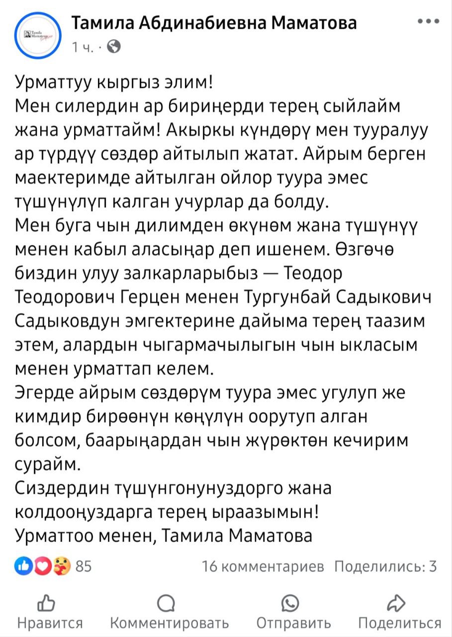 «Я искренне сожалею об этом и надеюсь на ваше понимание. Особенно я всегда глубоко почитаю труды наших великих деятелей — Теодора Герцена и Тургунбая Садыкова, искренне уважаю их творчество. Если какие-то мои слова прозвучали неправильно или задели чьи-то чувства, я искренне прошу у всех вас прощения. Я глубоко благодарна вам за ваши понимание и поддержку», — написала Тамила Маматова у себя на странице в соцсетях.