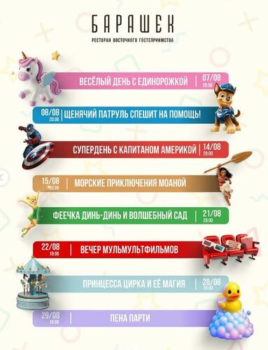 Детей ждут развлекательные программы: в четверг с принцессой цирка, в пятницу — пена-пати.