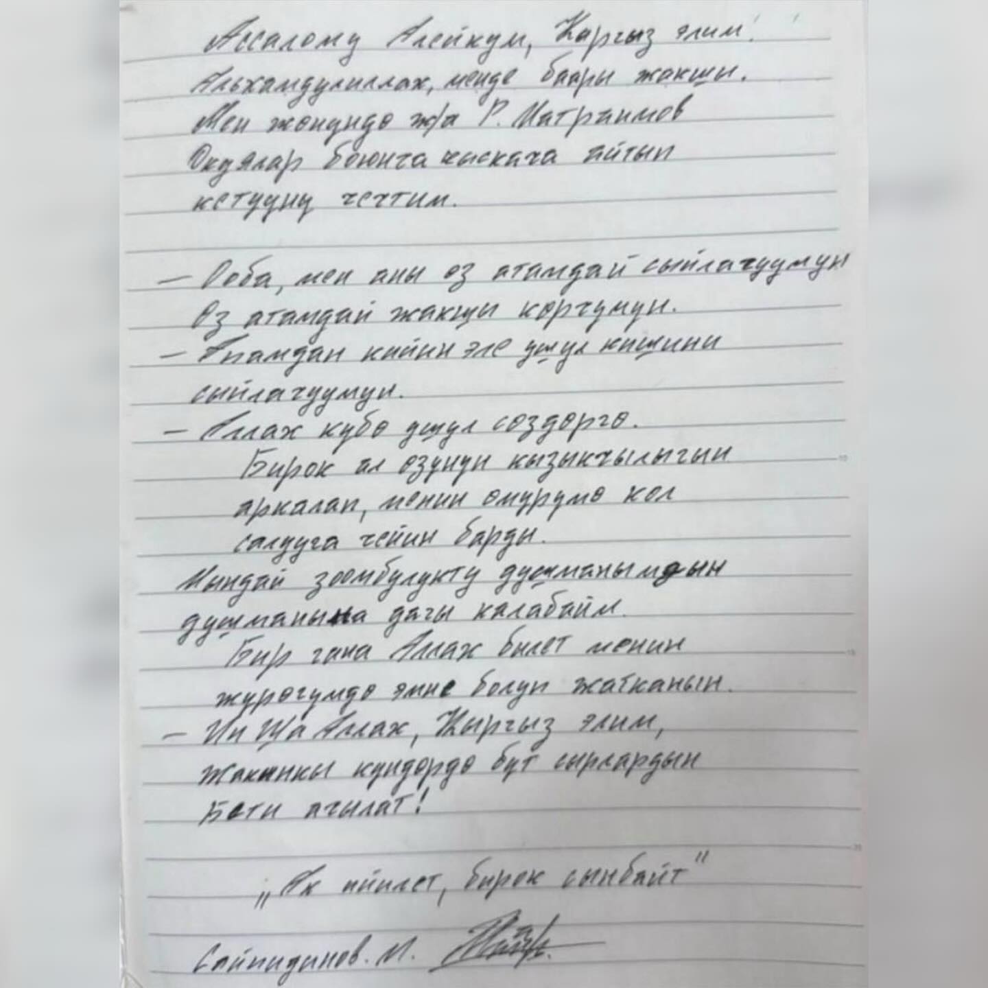 «Я уважал его как своего отца, после мамы это был человек, к которому я был особенно близок. Но он ради собственной выгоды дошел до попытки покушения на мою жизнь. Такого насилия я не желаю даже врагу. Только Аллах знает, что творится в моем сердце. ИншаАллах, вскоре правда станет известна всем кыргызстанцам», — написал Сайпидинов.
