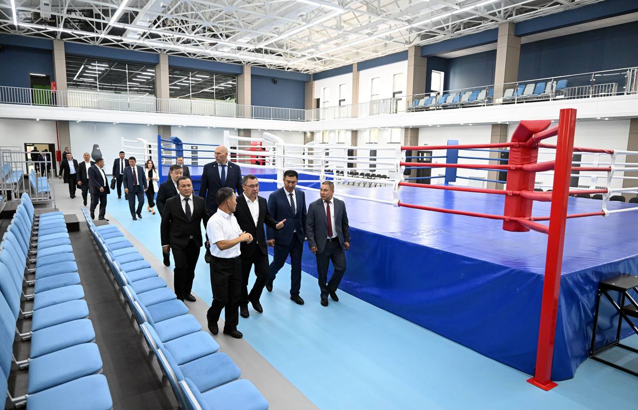 Президент посетил со своей делегацией новое здание Академии бокса. Среди гостей были глава ГКНБ Камчыбек Ташиев и мировая звезда бокса, бывший чемпион мира в тяжелом весе, а ныне депутат Государственной думы России Николай Валуев.