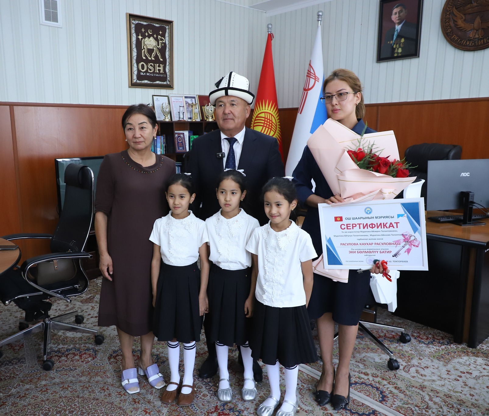 Мэр Оша Женишбек Токторбаев вручил ключи от двухкомнатной квартиры тройняшкам. Об этом сообщает пресс-служба муниципалитета.
