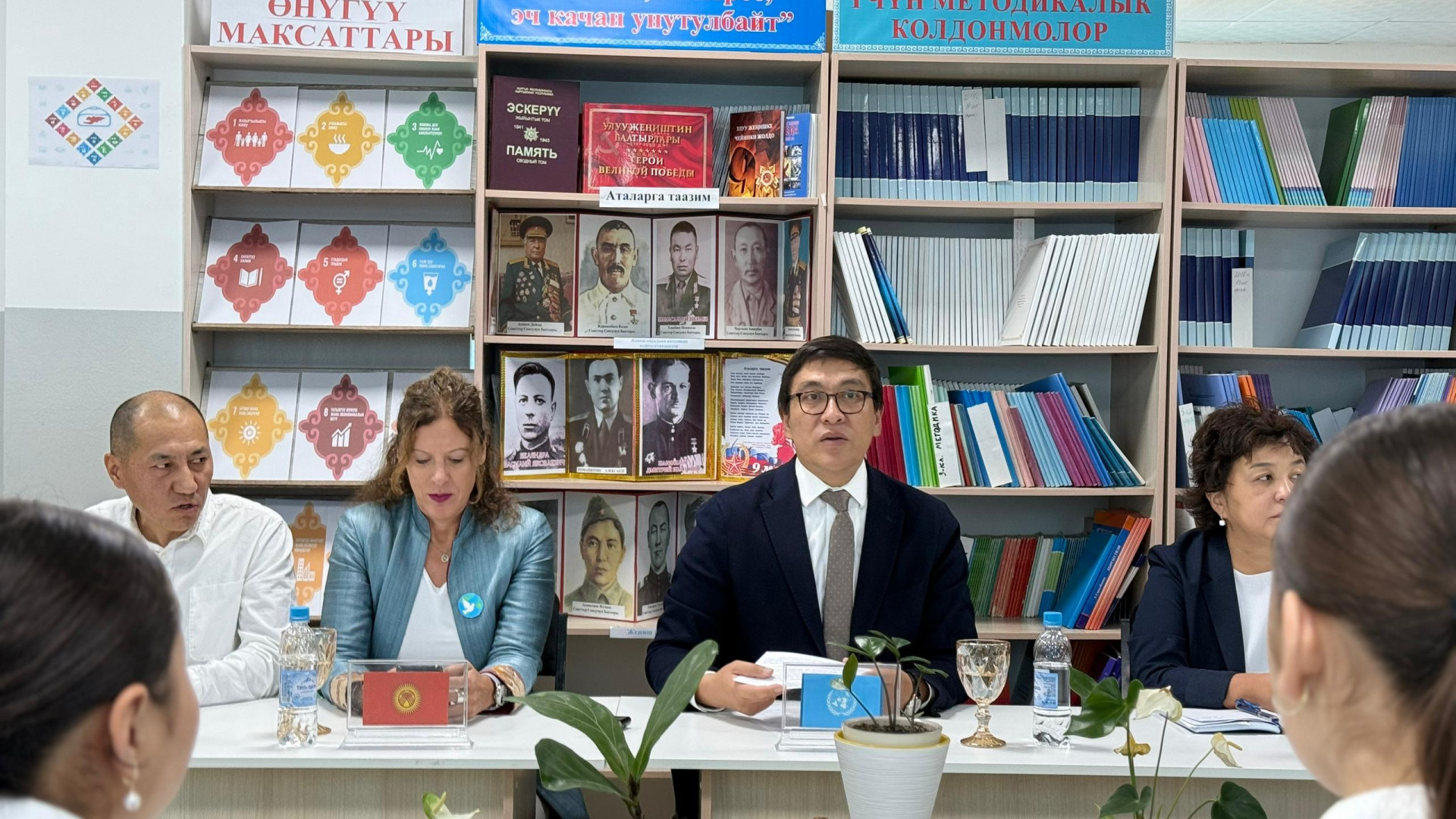 В средней школе № 100 имени Байдылды Сарногоева в Бишкеке состоялся классный час с участием заместителя председателя кабинета министров Эдиля Байсалова и Постоянного координатора системы ООН в Кыргызстане Антье Граве.