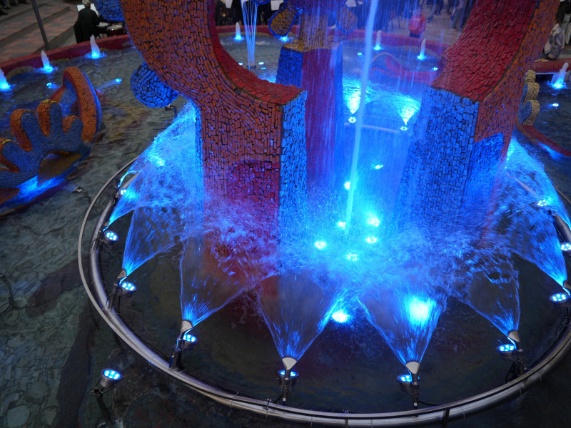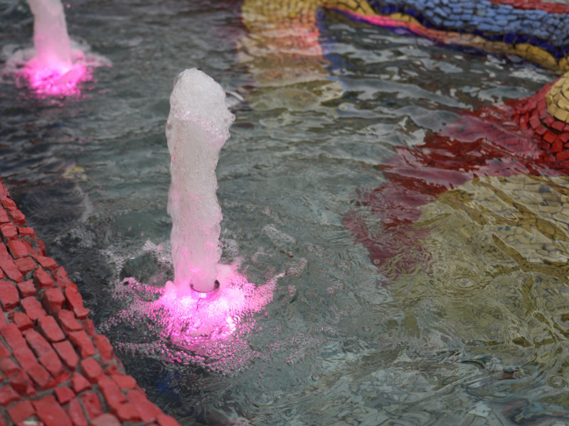 Ремонт фонтана включал полный комплекс демонтажных и восстановительных работ. Поверхность очищена пескоструйной обработкой, демонтированы старая система подачи воды, избыточный слой бетона над мозаикой, старое покрытие территории и освещение.