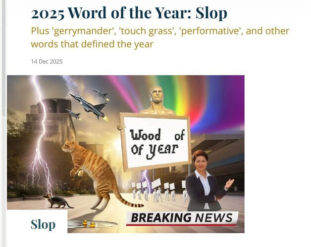 Это слово означает низкокачественный цифровой контент, создаваемый в больших количествах и с помощью искусственного интеллекта. К «слопу» словарь причисляет абсурдные видеоролики, нелепые рекламные изображения, фейковые новости и все прочие низкокачественные медиапродукты, сгенерированные с помощью нейросетей.