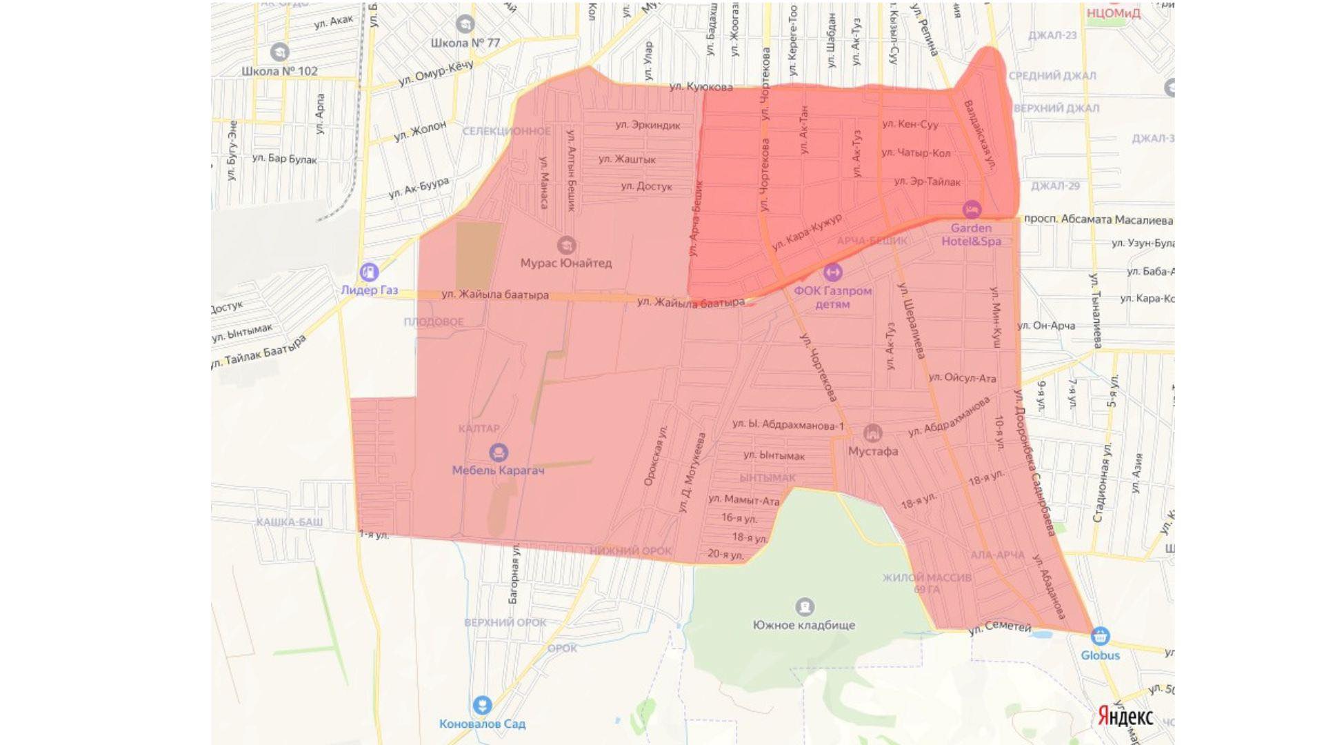 Район отключения: южная часть жилмассива «Арча-Бешик», улицы Семетей, Садырбаева, Жайыла Баатыра, Селекционная, Арча-Бешик, Куюкова, Эр-Тайлак, Кен-Суу, Чатыр-Куль, Кара-Кужур, Ак-Тан, Ак-Туз, Валдайская, трасса села Джал.