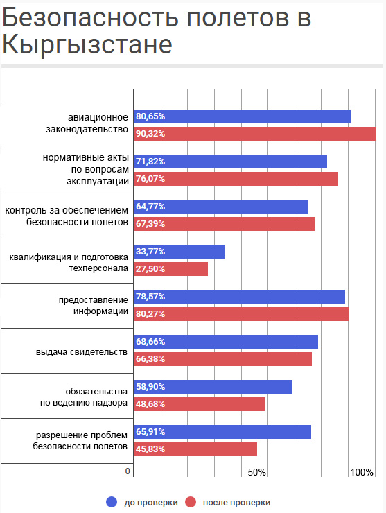Кыргызстан знает, как должно быть по правилам, но исполнение законов хромает. Поэтому показатели по выдаче свидетельств авиационному персоналу и летной эксплуатации ухудшились по сравнению с результатами аудита 2009 года.