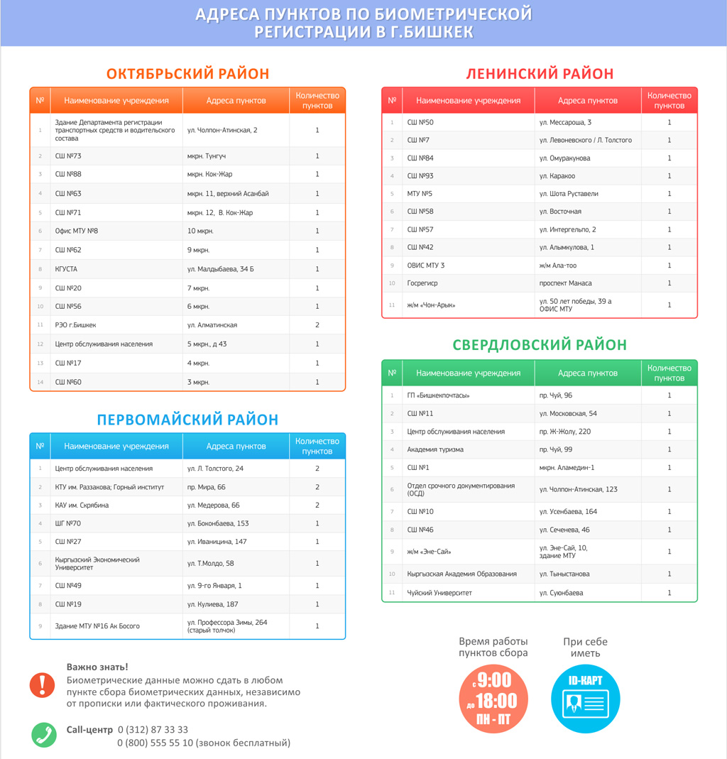 Напомним, что с 20 октября в Бишкеке начался массовый сбор биометрических данных граждан КР старше 16 лет. Всего планируется собрать данные 3 миллионов 641 тысячи 470 человек.