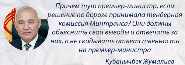 Также он напомнил, что скандал с дорогой Балыкчи — Корумду изучала депутатская комиссия, которую он возглавлял. В вину экс-премьеру ставили то, что он вовремя не внес поправки в бюджет для финансирования дороги. Но в итоге новый премьер поправки внес, Жогорку Кенеш их принял.