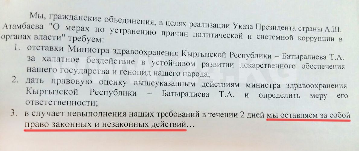 Участники второго митинга назвали себя представителями медицинского и гражданского сообщества, требующего рассмотреть вопрос о соответствии министра здравоохранения Кыргызской Республики Талантбека Батыралиева занимаемой должности. Самих участников этого пикета насчитывается не более 20 человек, среди которых и проходящие мимо зеваки, но хоть раз столкнувшиеся в своей жизни с кыргызской медициной.