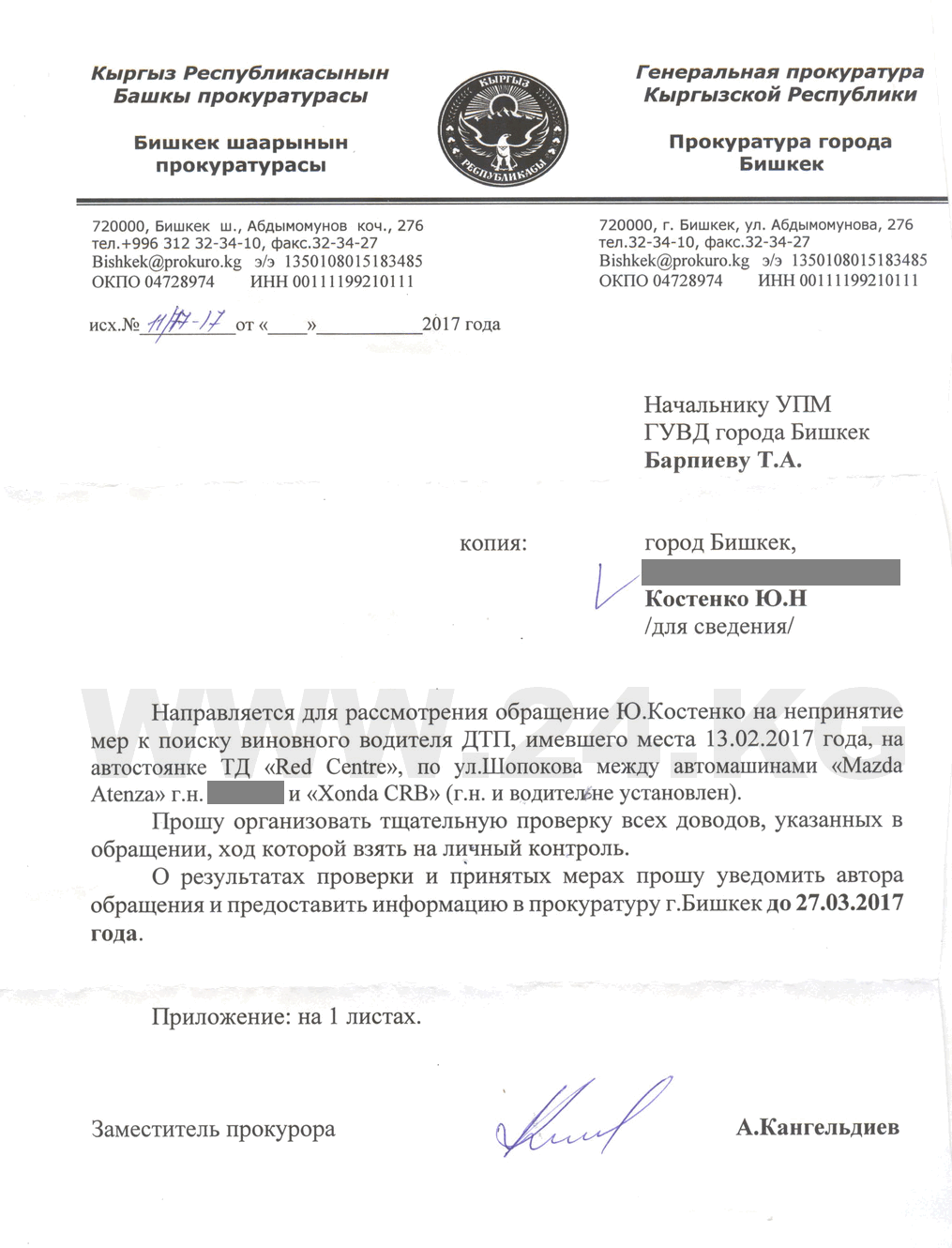 Пришел ответ от заместителя прокурора Асана Кангельдиева, адресованный начальнику УПМ ГУВД Бишкека Таланту Барпиеву: «Прошу организовать тщательную проверку всех доводов, указанных в обращении, ход которой взять на личный контроль». О результатах проверки следовало доложить в столичную прокуратуру до 27 марта.