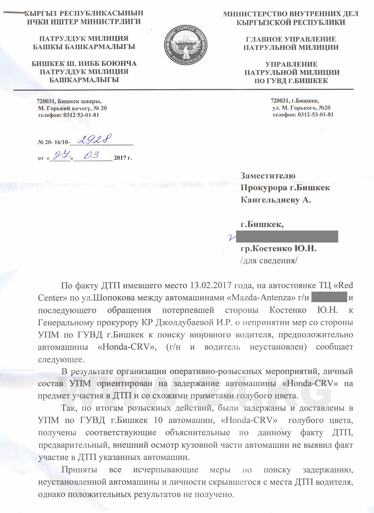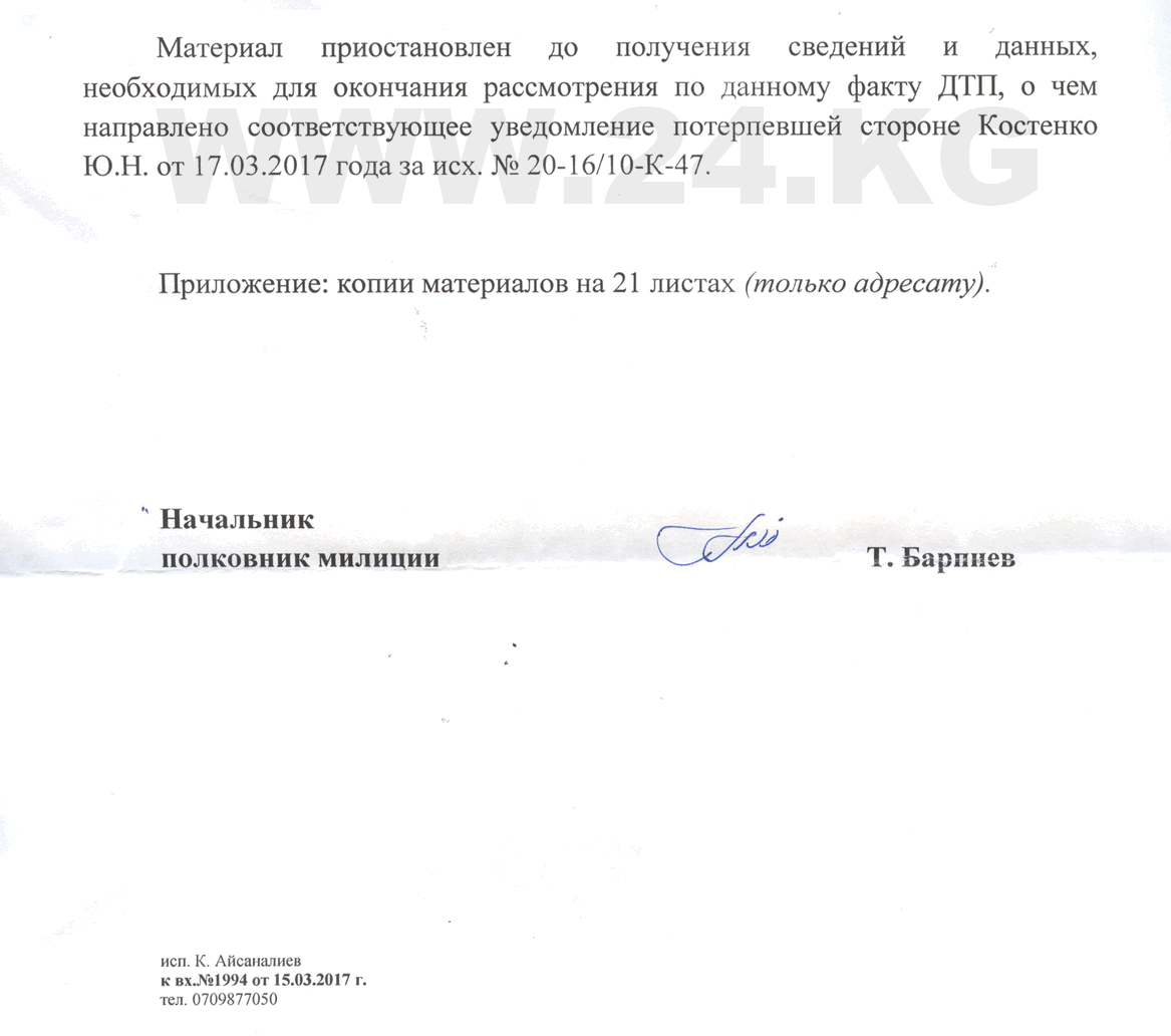 Ответное письмо поступило и от Барпиева. «По итогам разыскных действий задержаны и доставлены в УПМ ГУВД Бишкека 10 автомашин Honda CRV голубого цвета, получены объяснительные. Предварительный внешний осмотр кузовной части машин не выявил факт участия в ДТП. Приняты все исчерпывающие меры по поиску и задержанию скрывшегося с места ДТП водителя, однако положительных результатов не получено», — говорится в письме.