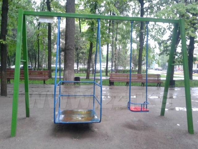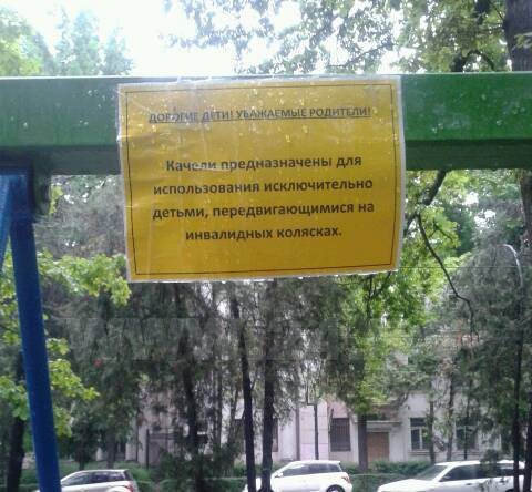 Две качели были установлены 26 апреля Фондом «Сорос-Кыргызстан» и Институтом развития молодежи. Не прошло и месяца, как горожане стали качать на них по несколько детей одновременно, качались и взрослые, да так, что сломали пандус на одной из них. Теперь заехать на нее инвалиду-колясочнику невозможно.
