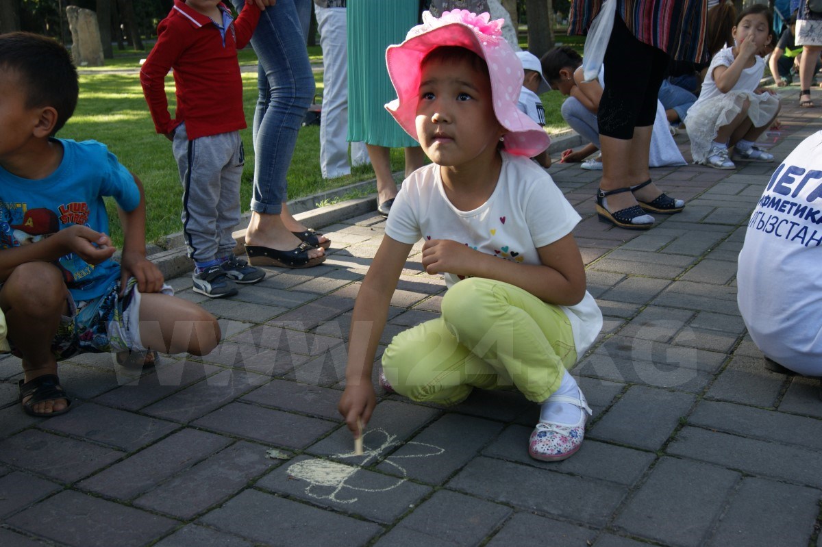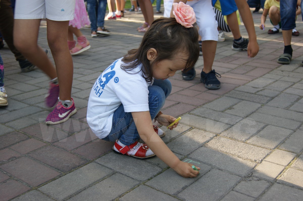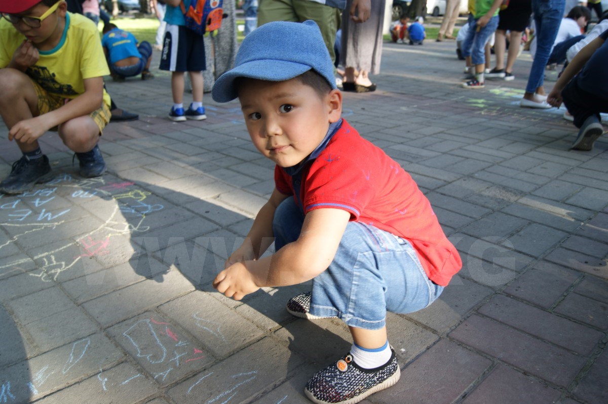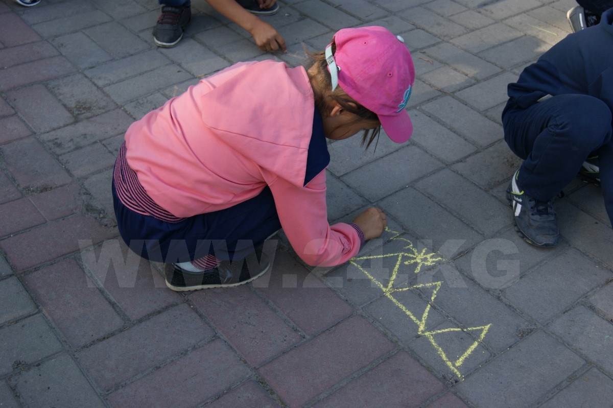 После танцев организаторы раздали всем детям разноцветные мелки и предложили нарисовать их видение сегодняшнего образования в Кыргызстане. Справиться с нелегким заданием маленьким кыргызстанцам помогали родители, которые с неменьшим задором поддерживали ребятишек и в танцах.