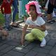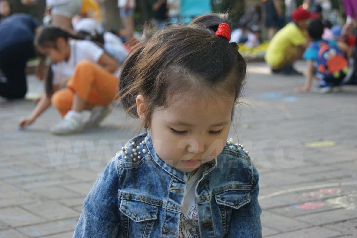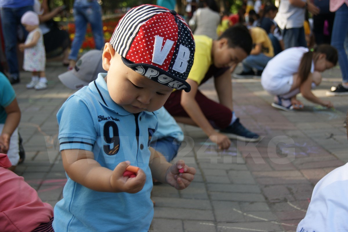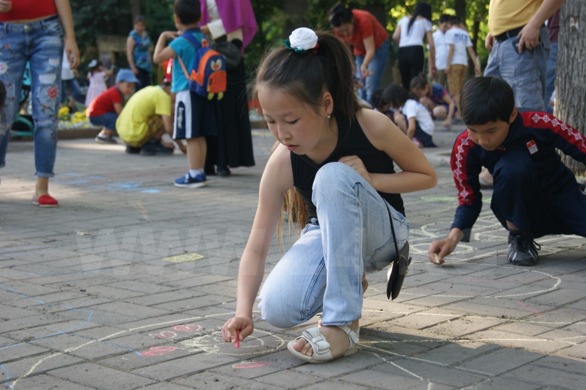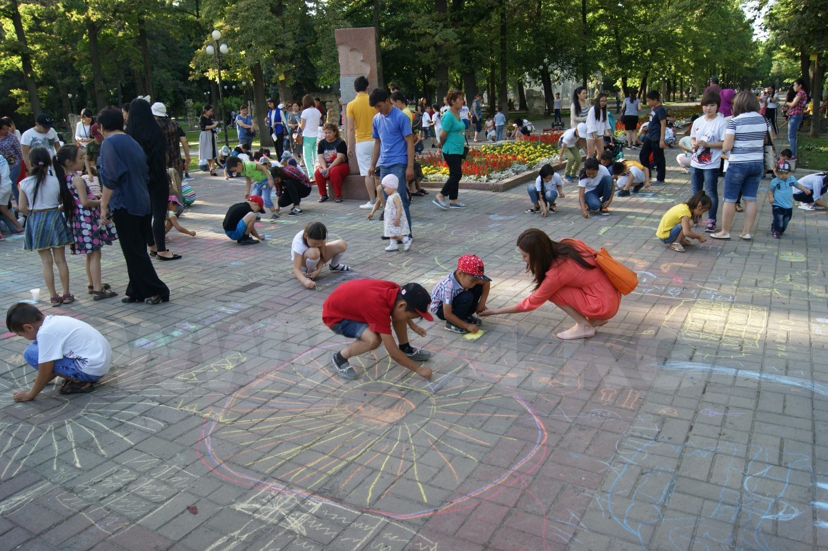 После танцев организаторы раздали всем детям разноцветные мелки и предложили нарисовать их видение сегодняшнего образования в Кыргызстане. Справиться с нелегким заданием маленьким кыргызстанцам помогали родители, которые с неменьшим задором поддерживали ребятишек и в танцах.