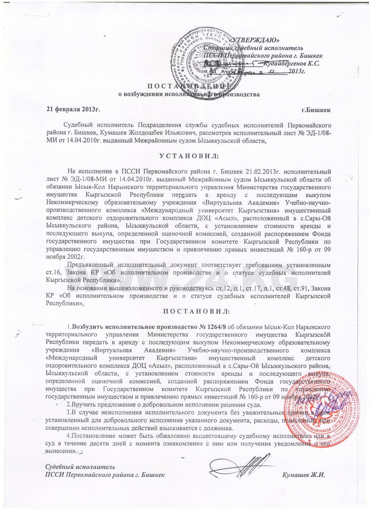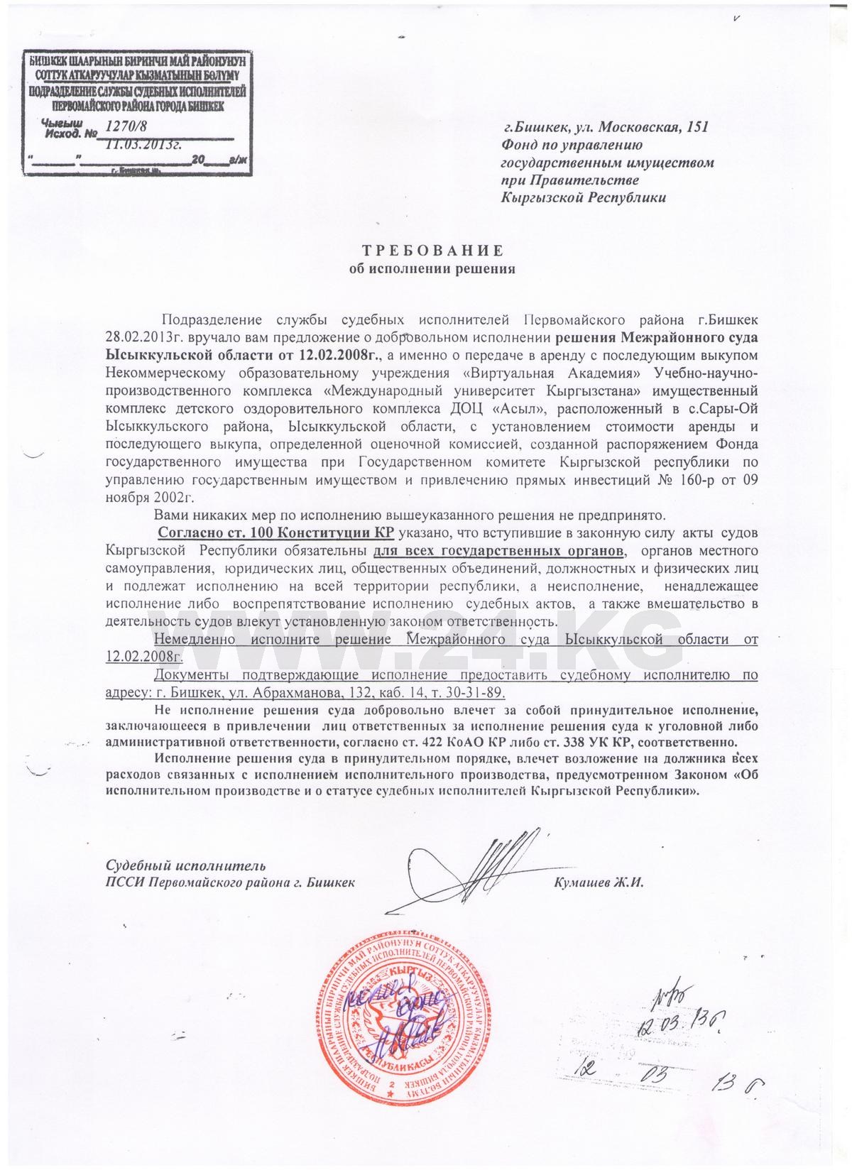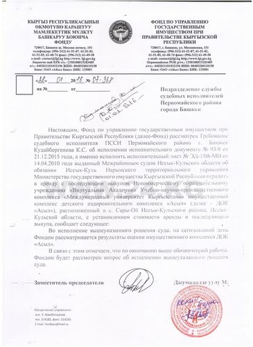 В ФУГИ ИА «24.kg» представили свое видение происходящего. Приказом от 12 марта 2003 года № 21-п утверждена оценочная стоимость имущественного комплекса ДОЦ «Асыл» в 2 миллиона 206,7 тысячи сомов. Объект решили выставить на конкурс, а не реализовать напрямую некоммерческому образовательному учреждению «Виртуальная академия» учебно-научно-производственного комплекса «Международный университет Кыргызстана».