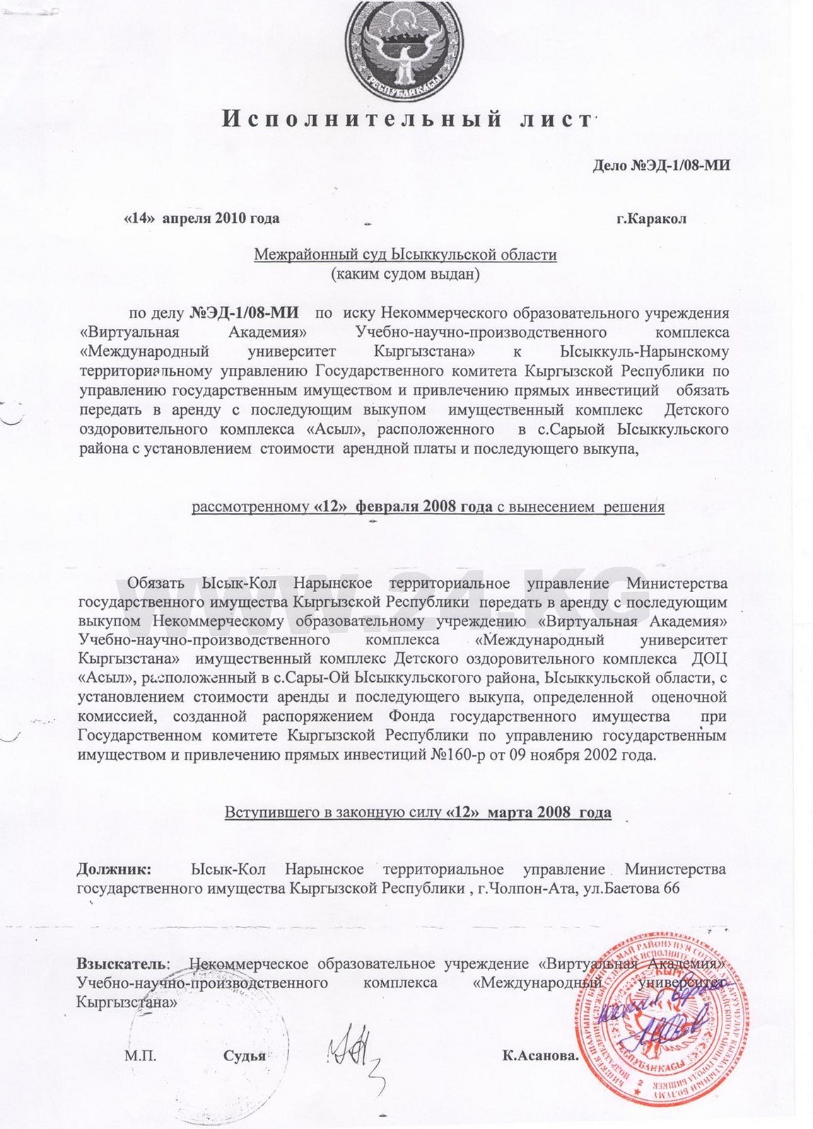 Около 3,5 гектара в селе Сары-Ой передали неизвестным, а оставшуюся территорию планировало забрать ЦАРИИ. В 2010 году Межрайонный суд Иссык-Кульской области вроде бы поставил точку в бесконечных попытках завладеть пансионатом, выдав исполнительный лист о передаче «Асыла» на баланс Виртуальной академии МУК. Но не тут-то было.