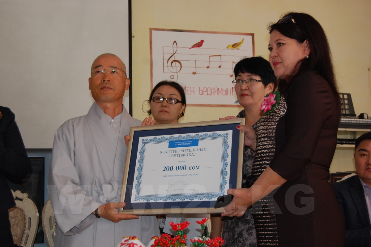 Также на церемонии буддийский монах передал сертификат на 200 тысяч сомов. Сертификат с подобной суммой будет вручаться ежегодно.