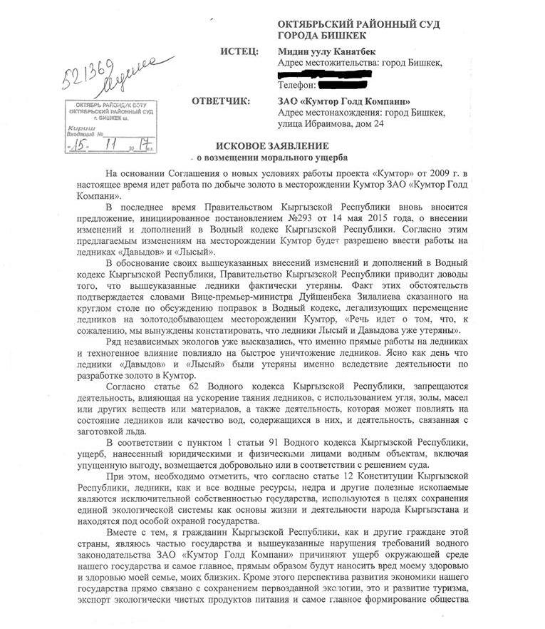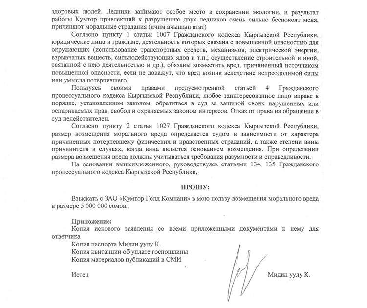 «Сегодня подал иск в Октябрьский районный суд города Бишкека на ЗАО «Кумтор Голд Компани» о возмещении морального ущерба за то, что творят с ледниками», — написал он.