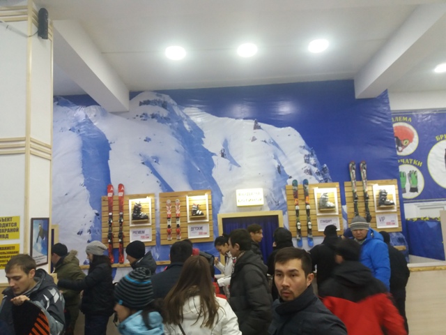 Своя экипировка — горнолыжный костюм, шлем, маска — у меня была. Дело осталось за малым: найти лыжи. Благо пунктов проката в Бишкеке, да и на самих базах много. Утром 2 января отправляемся на горнолыжку. Лыжи, палки и ботинки решено брать в прокате по дороге: подстраховались — вдруг народу на базе будет много, и нужного комплекта может просто не оказаться.