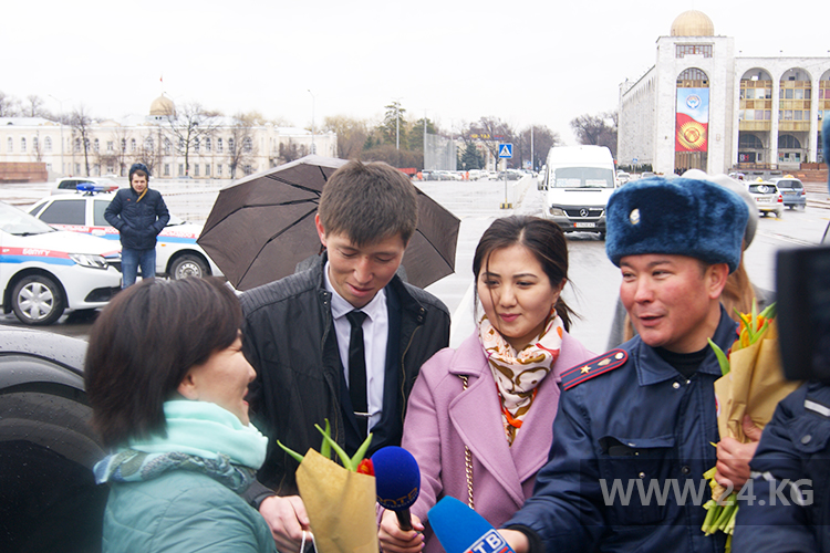 Цветы вместо штрафа. Как в Бишкеке поздравляли с 8 Марта женщин-водителей