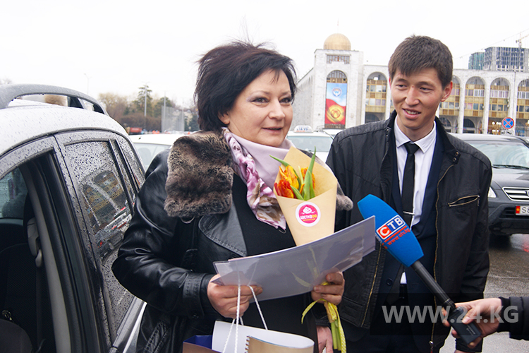 Местом действия выбрали площадь Ала-Тоо. За поворотом встали служивые с палочками и начали тормозить автомобили с женщинами за рулем. Некоторые из них, решив, что что-то нарушили, стали протягивать водительские права и техпаспорт. А им в ответ — поздравления и презенты: цветы, открытки, игрушки, подарочные сертификаты, пригласительные на ужин...