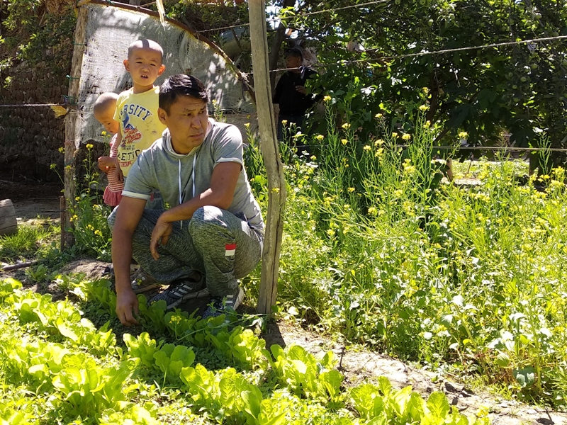 Жителю села Кыргыз-Чек 36 лет. Восемь из них он провел в трудовой миграции в России. От первого брака остались двое детей. Со второй женой Зухрой вместе работали в кондитерском цехе в Новосибирске: она кондитером, он грузчиком. Она родом из Токмака. Она дунганка, он кыргыз.Вернувшись в его родное село, пара занялась развитием сельского хозяйства. Зухра стала матерью детям мужа и родила еще троих. Сейчас старшие подростки помогают по дому, младшей Ясмине 3 года. В эти дни Зухру позвали токмакские родственники помочь с работой на полях. Талант остался с детьми. На десяти сотках у него целое хозяйство: черешня, виноградник, инжир, тут же сирень, цветут вьющиеся красные розы, а на грядках томаты.