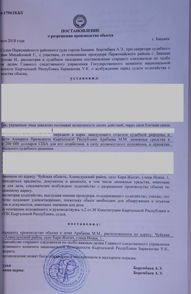 Выложено также постановление о разрешении производства обыска дома у Манаса Арабаева. В документе указывается, что обыск в доме Манаса Арабаева в Чуйской области разрешен для обнаружения и изъятия документов по делу.