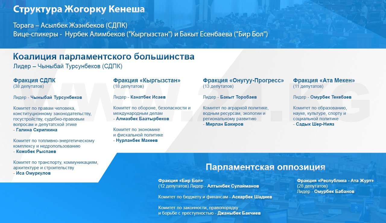 Представитель «Республики – Ата Журт» Кенжебек Бокоев предложил, чтобы у главы комитета был один заместитель, избранный по такой схеме: если глава комитета представляет коалицию, то его заместитель должен быть от оппозиции, и наоборот. На что спикер Асылбек Жээнбеков заявил: «Мы принимаем решение, что заместителей должно быть не более двух, то есть может быть и один. Это вы решайте в комитетах».