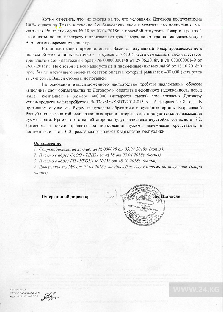 В апреле прошлого года о себе напоминает Токмакский нефтеперерабатывающий завод. Лю Цзяньсян пишет письмо и просит вернуть 400 тысяч сомов долга.