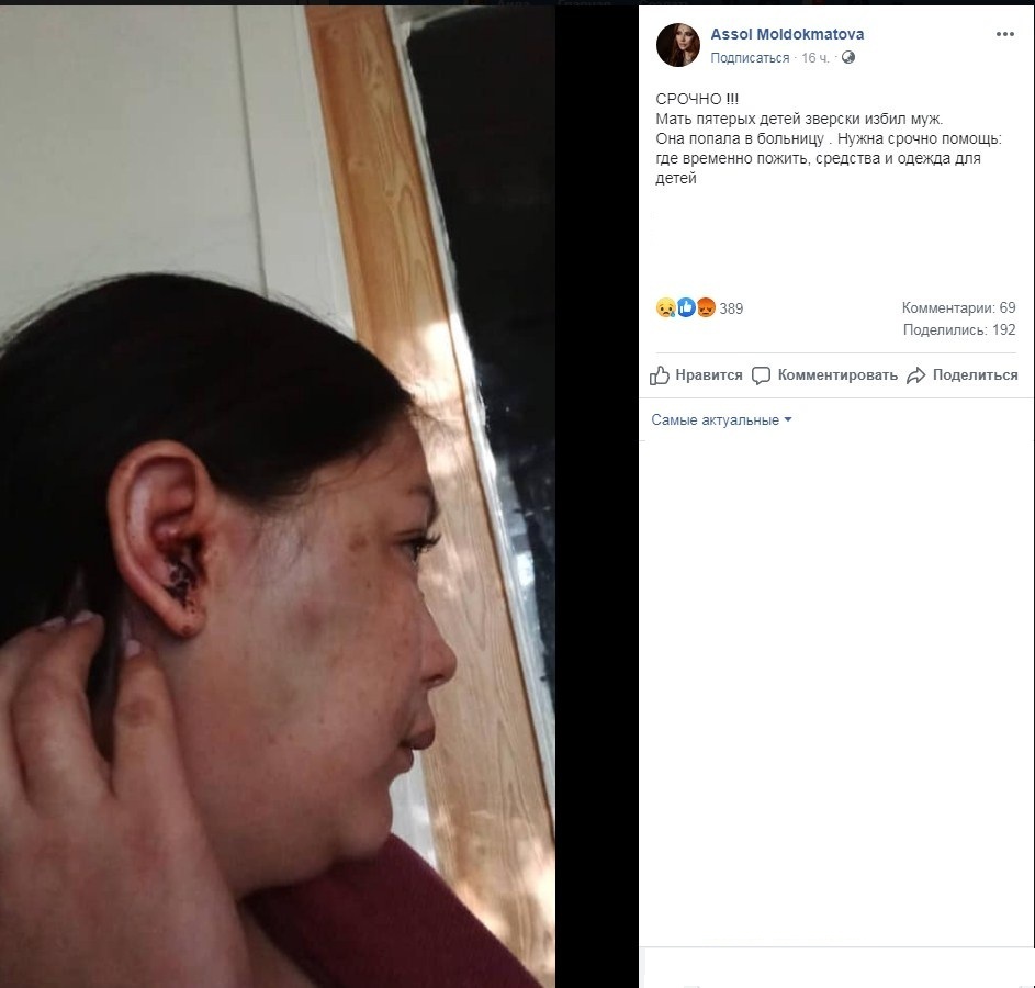 В Бишкеке мужчина жестоко избил свою жену. Об этом на своей странице в социальной сети Facebook сообщила общественный деятель Ассоль Молдокматова.